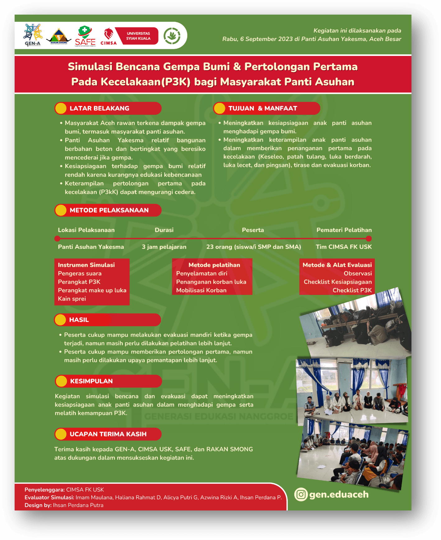 Simulasi Bencana Gempa Bumi & Pertolongan Pertama Pada Kecelakaan (P3K) bagi Masyarakat Panti Asuhan