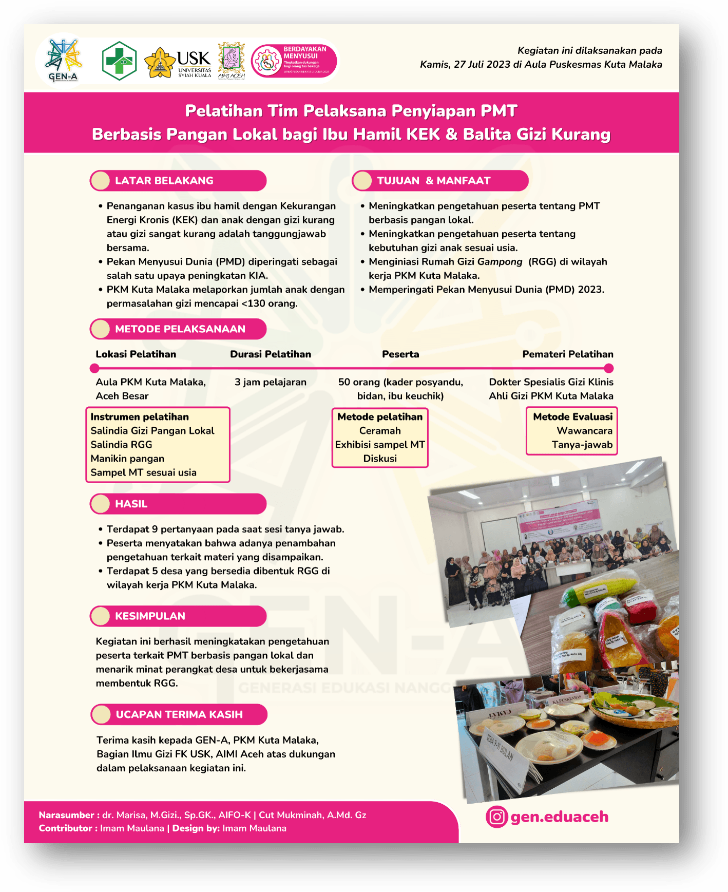 Pelatihan Tim Pelaksana Penyiapan PMT Berbasis Pangan Lokal bagi Ibu Hamil KEK & Balita Gizi Kurang